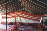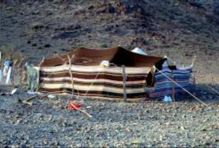 Los ex-nomades socializan debajo de una tienda de campaña como si estuvieran en el desierto. Detrás de la tienda se ve un tanque de agua, en lugar de largos tensados de cuerdas. La tienda está soportada por postes de metal; dentro y fuera de los puestos, con cuerdas tensoras cortas , postes metálicos ,en lugar de los de madera; el diseño de la cubierta es no tradicional para esta zona; el divisor de tienda hecha localmente se cuelga desde un techo alto. Mientras que han sido colgados de postes de la tienda, cojines, reposa brazos y alfombras son de fabricación extranjera.