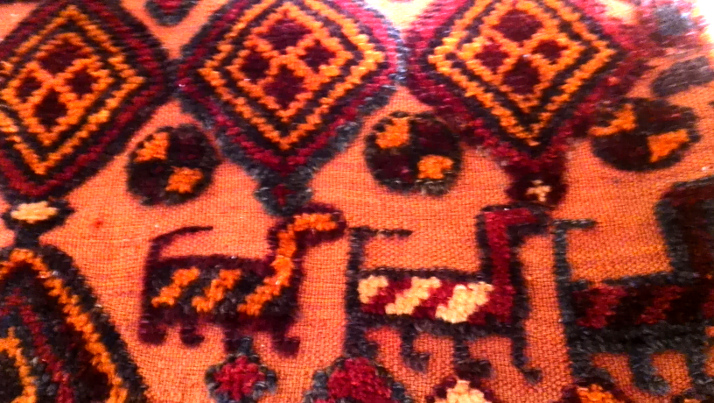 1- El centro de la alfombra decorado con nudo turco denominado Ghiordes , con diseños geometricos , flores , camellos, cabras y perros.