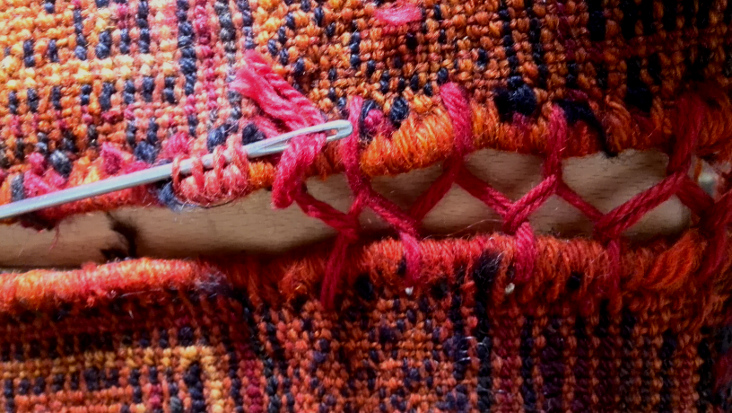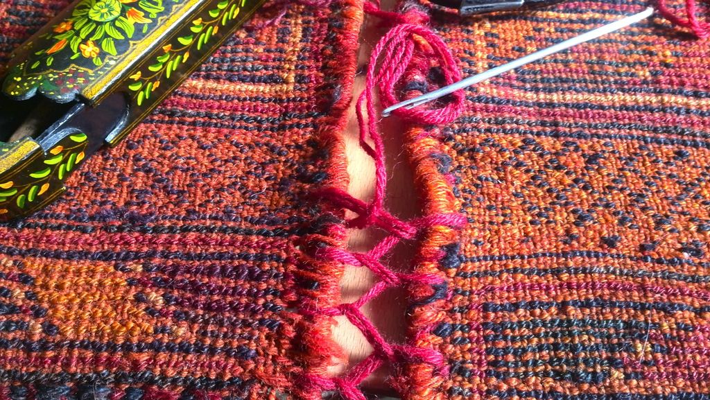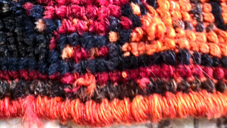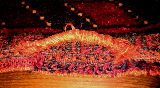 c) Terminaciones de los flecos forman bandas de envoltura oblicua , realizados con la técnica Soumak.