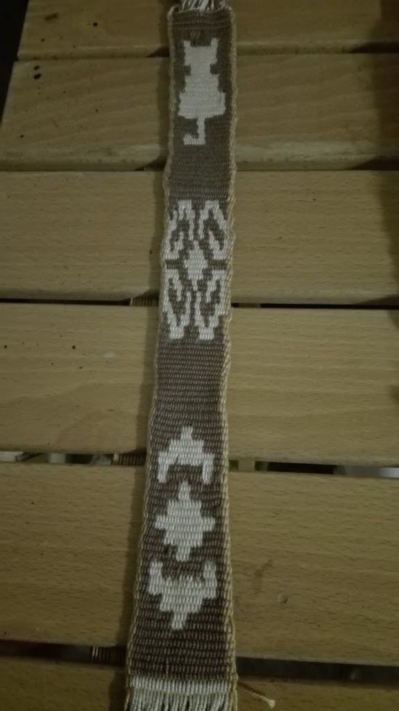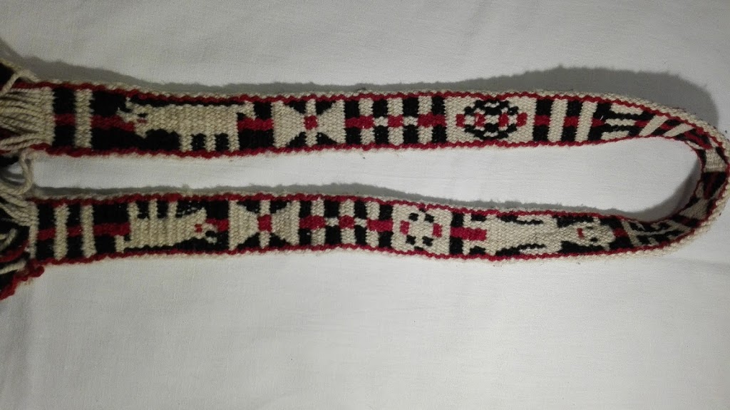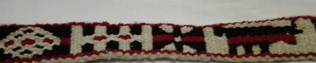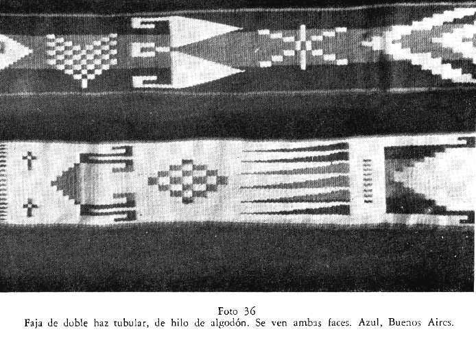 La tengo de fotocopias sueltas, de varias fuentes, del material didáctico del Museo José Hernández,del curso de Cecilia Lerma.Lo busco,si encuentro el libro lo publico, abajo de la foto. Un detalle que se mencionaba de esa faja es que las fajas tejidas en Azul(Bs.As.) tenían la «firma» de la tejedora,con peq.dibujos propios de c/u,en esta faja abajo a izquierda está representada con dos cruces.