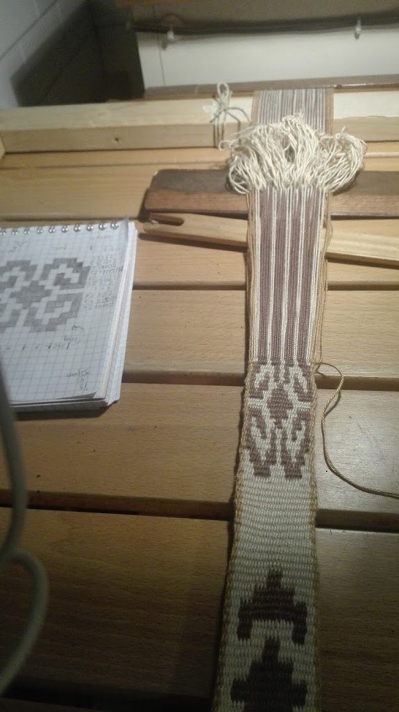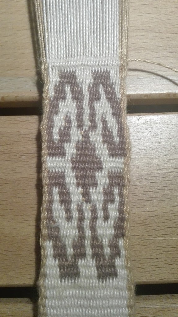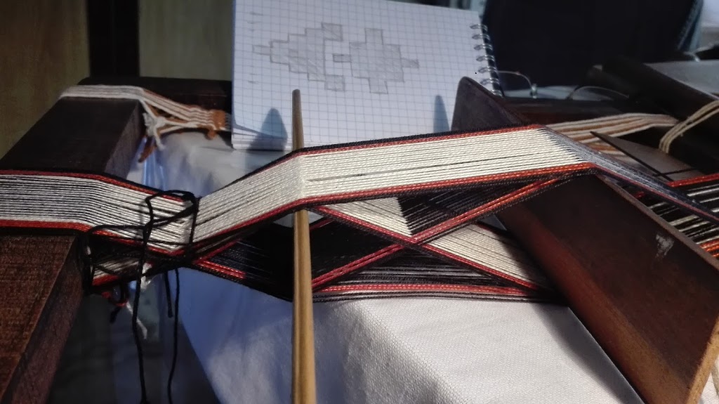 El diseño de la faja que me mostras,es igual en ambas capas, en cada una , con colores invertidos. Dos urdimbres y una única trama rectilínea entre las dos urdimbres (no como en la tubular que pasa en forma circular) las capas centrales de las urdimbres se alternan, a veces como estructura y otras como flotantes, en el haz y en el envés. En el eje horizontal, una urdimbre por medio flota, alternándose. Es una mas de las “doble faz de urdimbres flotantes” pero en este caso, en el eje vertical , flota sobre , 1,2,3, o 4 tramas , pasa debajo de una y deja entrever los pasajes de trama y de las urdimbres del otro color, de las capas centrales, lo que produce un efecto reticular muy característico. Sobre esto hay una entrada en el blog https://www.textilideas.com/2019/01/tecnica-doble-faz-con-flotantes/