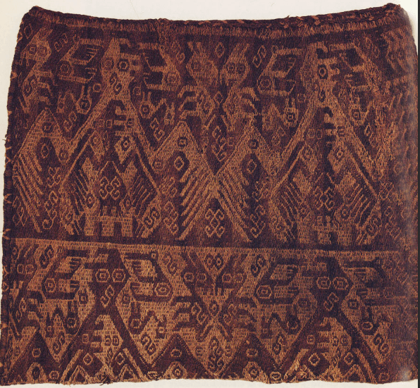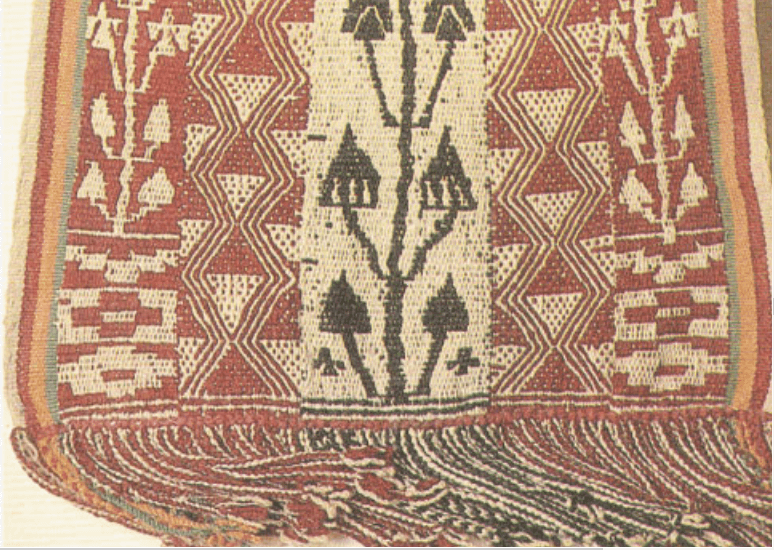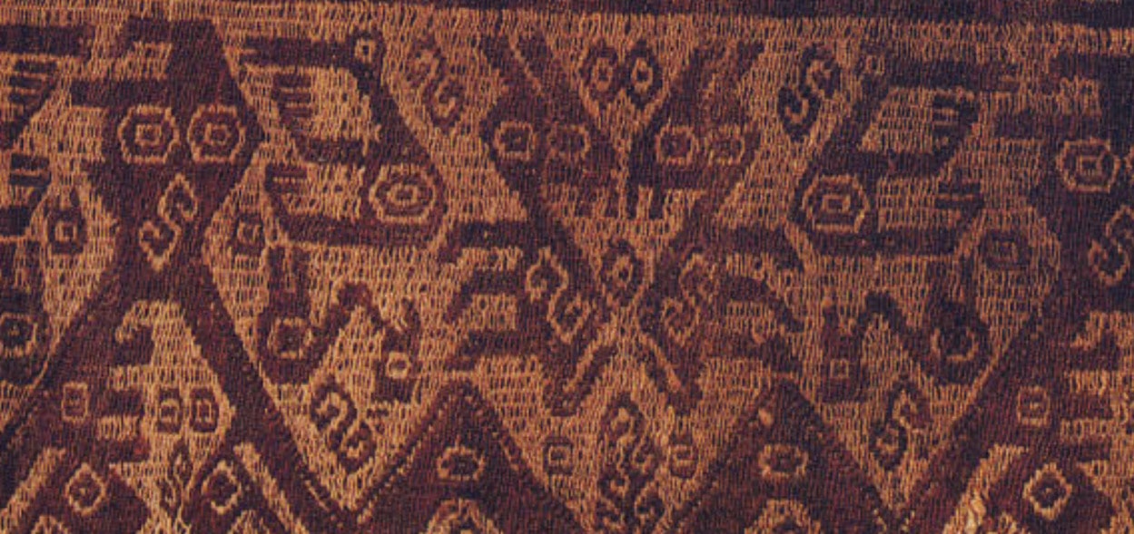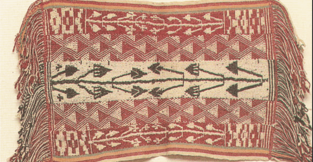 ……Del sitio Huanca Prieta, costa norte del Perú posiblemente , Periodo Preceramico tardío (3.000 2000 a.C).en el sitio de la necrópolis de Paracas, del intermedio temprano (200 a.C 600 d.C) , Huari ,del horizonte medio costa sur del Perú. (400-900 d.C) ,Maytas Chiribaya 1250-1430 d.C, en Chuquisaca Bolivia Horizonte medio,Costa Sur del Perú, Horizonte Tardío (1400-1535 d.C). Actualmente Cusco – Perú , Norte de Potosí- Bolivia……Denise Y. y Elvira Espejo «Ciencia de Tejer en los Andes» .